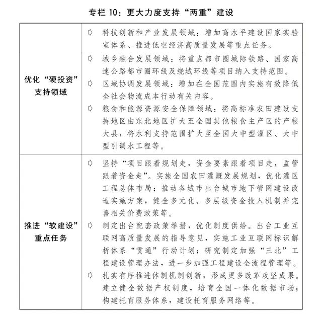 三是加力推进“两重”建设。进一步完善自上而下的工作机制,加强“两重”建设项目储备,更好统筹“硬投资”与“软建设”。安排超长期特别国债8000亿元支持“两重”建设,进一步优化具体投向并提高项目支持比例,重点支持基础研究能力提升、未来产业发展、东北等重点地区高标准农田建设、大中型灌区新建改造及大中型引调水和大中型水库建设、长江经济带生态环境保护和绿色发展、农业转移人口市民化公共服务体系建设、高等教育提质升级、城市地下管网管廊建设改造等方面任务,强化超长期贷款等配套融资,高质量推进“硬投资”项目谋划实施。加大力度推动“软建设”政策落地见效。