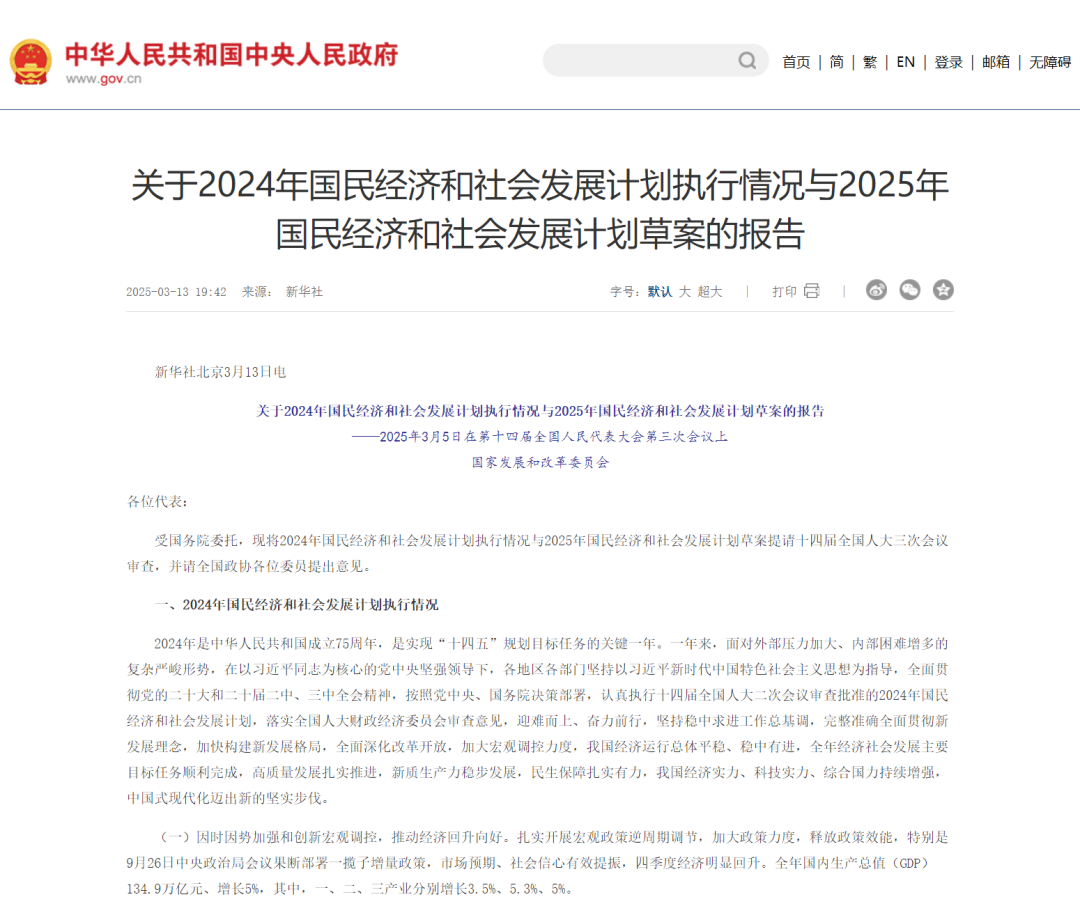 报告全面总结了我国2024年国民经济和社会发展计划执行情况,并对2025年经济社会发展总体要求、主要目标和政策取向进行了详细的阐述。