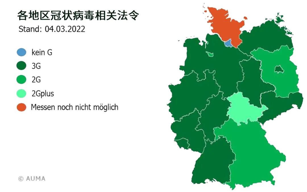依据新的冠状病毒法令:自3月4日起,贸易展览会可以再次举行。符合3G-Regel(已接种欧盟认可疫苗 / 新冠康复 / 新冠病毒检测呈阴性)的参与者可进入展览中心及展厅。该政策将持续至2022年3月19日。