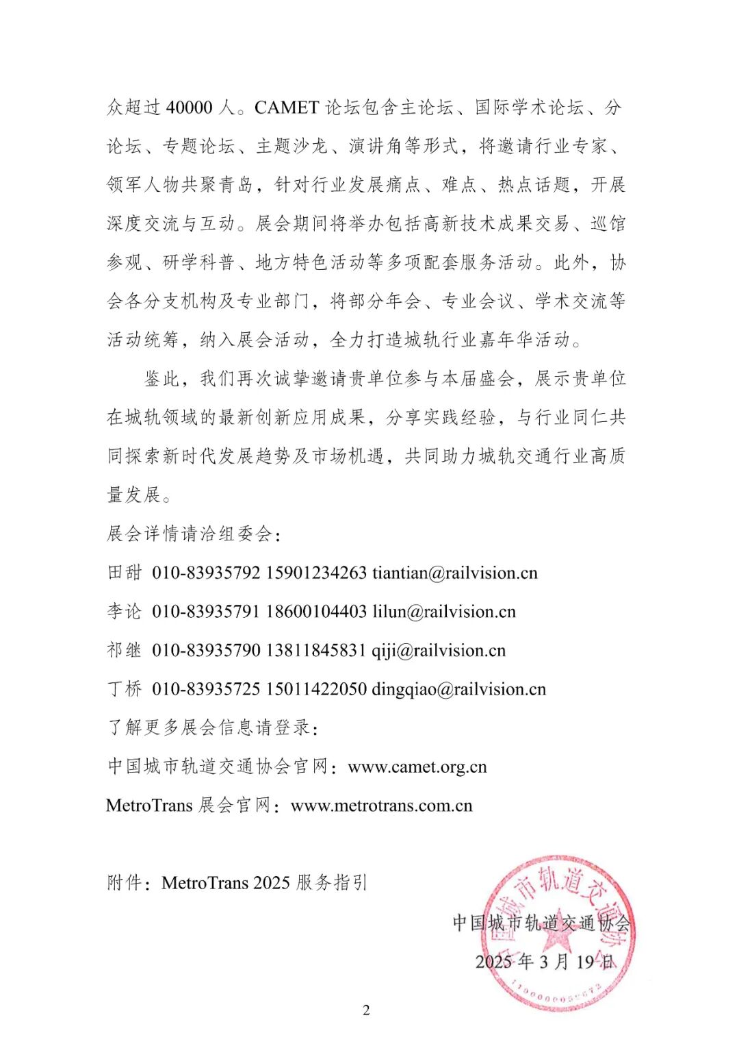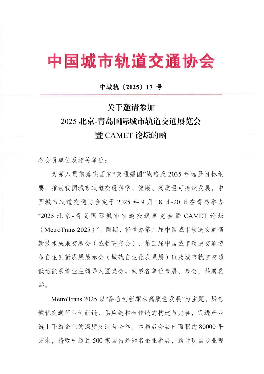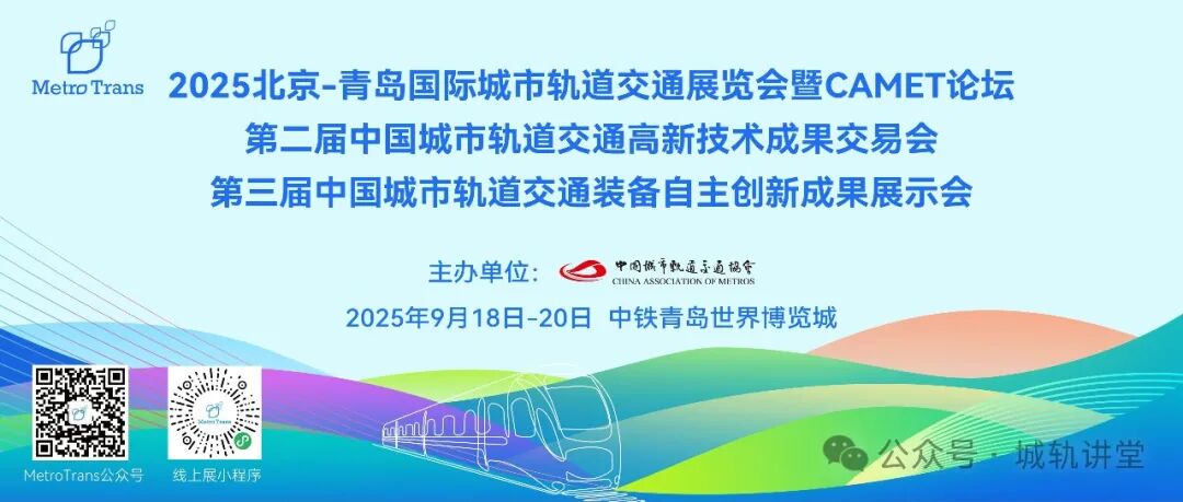 为深入贯彻落实国家“交通强国”战略及2035年远景目标纲要,推动我国城市轨道交通科学、健康、高质量可持续发展,中国城市轨道交通协会定于2025年9月18日-20日在青岛举办“2025北京-青岛国际城市轨道交通展览会暨CAMET论坛(MetroTrans 2025)”。同期,将举办第二届中国城市轨道交通高新技术成果交易会(城轨高交会)、第三届中国城市轨道交通装备自主创新成果展示会(城轨自主化成果展)以及城市轨道交通低运能系统业主领导人圆桌会。诚邀各单位参展、参会,共襄盛举。
