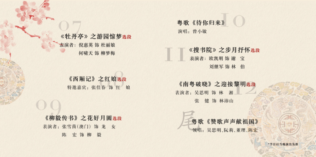 本台戏曲晚会汇集了中国戏剧梅花奖获得者倪惠英、丁凡、欧凯明、曾小敏、琼霞,著名京剧表演艺术家张佳春等戏曲名家。将带来《柳毅传书》选段、《牡丹亭之游园惊梦》选段、《搜书院之步月抒怀》选段、粤剧电影《白蛇传·情》主题曲《待你归来》等,生动展示中华传统戏曲的独特魅力。