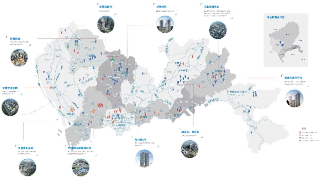 在这个区域,现场最为引人关注的是安居所有项目分布图,累计的114个项目遍布福田、南山、罗湖、宝安、龙岗、龙华等深圳所有行政区、新区、特别合作区,其中国有企事业合作开发项目30个,棚户区改造项目13个,新供应用地项目66个,土地整备利益统筹及其它项目5个,安居8年奋进历程在这里变得更加具体。