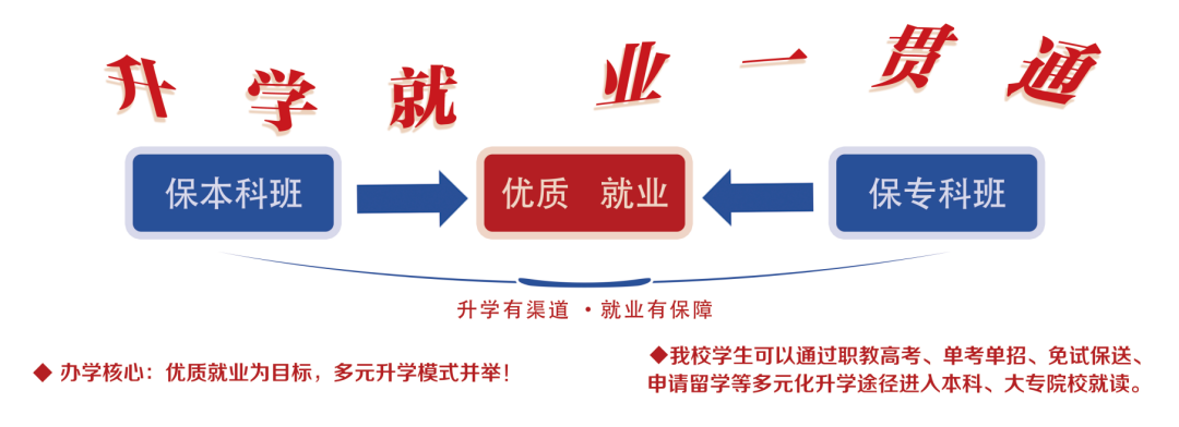 学生可在我校就读升学班,通过职教高考、中高职贯通、单招/对口升学、免试保送、申请留学等多元化升学途径升入本科、专科院校就读深造,与普通高中升入大学待遇完全一致,学生毕业发放教育部电子注册统招大专或本科毕业证。