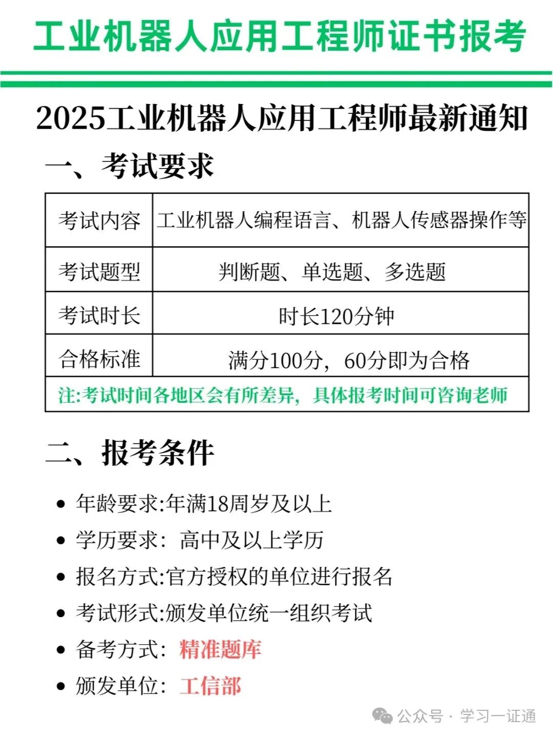 证书的考核内容包括工业机器人的概念、分类、工作原理、结构组成、编程与调试、编程语言、程序调试与故障排查、操作与维护、故障诊断与排除等。考核线上进行,会有备考资料提供,成绩在60分及以上合格。