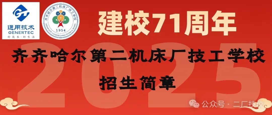 学校创建于1954年,是齐齐哈尔市第一所技工学校,隶属于通用技术齐齐哈尔二机床有限责任公司。学校是省级重点技工学校、通用技术集团装备制造培训中心、黑龙江省技工院校教师培训基地、黑龙江省高技能人才培训基地。校内教学设施完善,教学设备先进,师资力量雄厚,全校70%为双师型教师,确保教学质量。