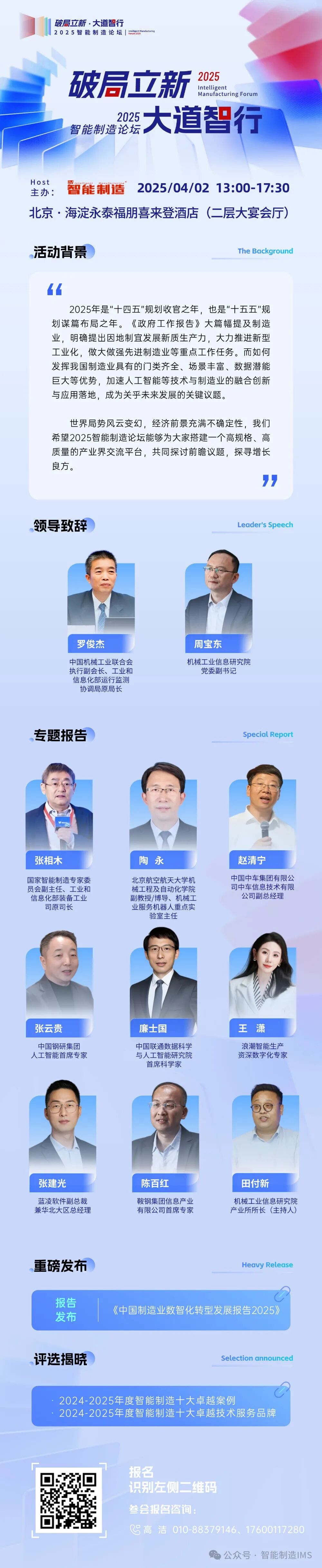 大咖阵容揭晓!2025智能制造论坛将于4月2日北京召开,欢迎报名 | 行业活动