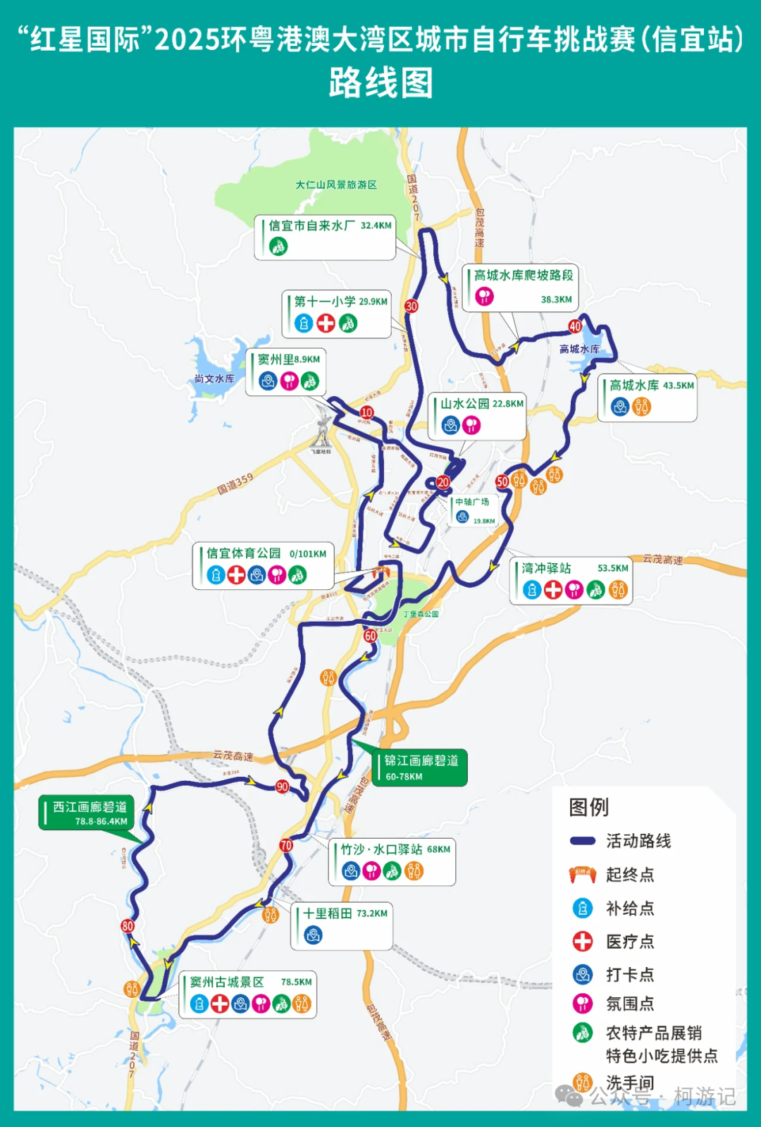 没料到,骑起来,竟然来了个空前体验!全程封路,大量交警辅警义工值守各个路口、转弯位、下坡处;路面质量极佳,九成是新修的彩虹路,平整无坑;围观者众,加油声欢呼声此起彼伏,气氛十分热烈;路线设计特别,市区路段特别多,主题公园多,风景点多,展现了信宜城市建设新面貌!