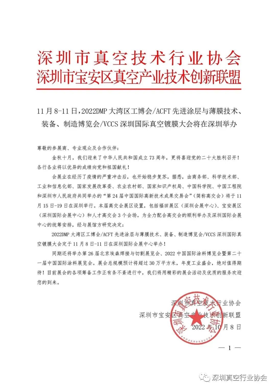 金秋十月,我们迎来了中华人民共和国成立73周年,更将喜迎党的二十大胜利召开!各行各业将以优异的成绩向党和祖国献礼!会展业在经历了疫情的严重冲击后,也开始稳步复苏。据悉,由商务部、科学技术部、工业和信息化部、国家发展改革委、农业农村部、国家知识产权局、中国科学院、中国工程院和深圳市人民政府共同举办的“第24届中国国际高新技术成果交易会”(简称高交会)将于11月15日-19日在深圳举行。本届高交会展区设置,包括福田展区(深圳会展中心)、宝安展区(深圳国际会展中心)和人才高交会3个会场。为全力配合高交会的顺利举办及深圳国际会展中心的统筹安排,经与展馆方研究决定:2022DMP大湾区工博会/ACFT先进涂层与薄膜技术、装备、制造博览会/VCCS深圳国际真空镀膜大会定于11月8日-11日在深圳国际会展中心举办!
