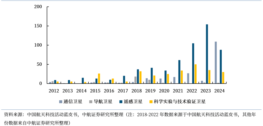 卫星是我国商业航天产业的重要空间基础设施。2024年,我国卫星发射数量持续增长,各类卫星星座加快建设。如下图所示,2024年我国通信卫星发射数量激增,主要系“国网”星座、千帆星座等多个低轨卫星互联网星座进入全面建设阶段,卫星发射频次增加。