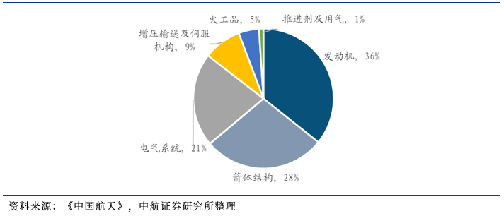 建议关注参与火箭核心环节或分系统的企业。根据美国ULA公司旗下最具竞争力的运载火箭——宇宙神5系列运载火箭的成本构成(如下图所示),火箭发动机成本占比达到36%。发动机是运载火箭硬件成本的主要构成,特别是液体火箭发动机。目前,我国除了整箭企业参与液体火箭发动机的研制外,也有部分民营企业专注于液体火箭发动机的研制和销售。除了火箭发动机外,推进剂贮箱也是液体运载火箭的核心部件之一,占据箭体结构体积的80%和重量的60%以上,是火箭必需的消耗品,其成本约占整箭成本的25%左右。火箭贮箱是一个工艺过程复杂、技术和工程门槛高、技术和人才稀缺的领域,值得重点关注。