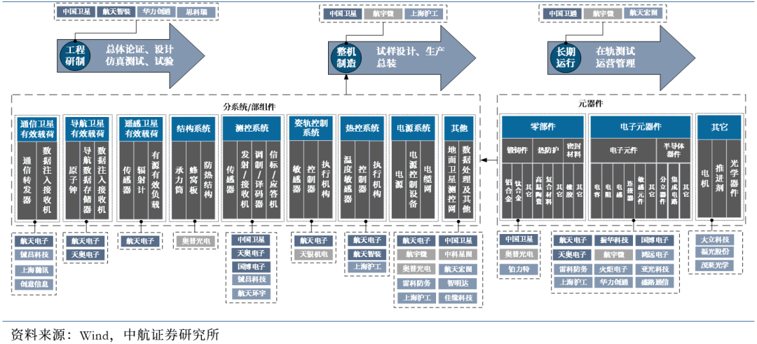 重点关注通信小卫星制造产业链上已经具有一定批生产的配套企业或总装企业收入与利润规模的提升。在通信小卫星中有效载荷、控制系统、电源系统以及测控系统的配套企业中,关注已经具有低成本及产业化能力的企业,或具有较高技术水平(毛利率较高),正处于产业化过程中的企业。