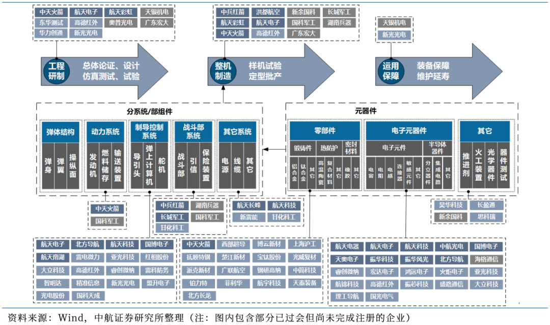 ④聚焦高价值分系统领域企业。在量或价方面具有优势的各类导弹(空地导弹、面空导弹以及空空导弹)中,比如在战斗部、动力系统、制导与控制系统及弹体结构等四个分系统中,重点关注成本占比较高的制导控制系统。