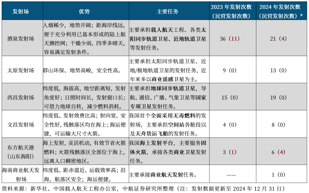 我国发射工位相对不足,发射能力与快速增长的发射需求存在不匹配。除海南商业发射场外,我国已建成四大航天发射场,包括酒泉发射场、太原发射场、西昌发射场以及文昌发射场。伴随着航天发射活动的持续增长,我国航天发射能力与快速增长的发射需求存在不匹配。一方面,我国航天发射次数快速增长。2019年以来,我国航天发射次数逐年增长,预计2025年发射次数有望接近百次。另一方面,我国专门用于民营火箭发射的工位较为稀缺。根据我们的统计,2023年以来,我国民营火箭发射任务大多集中在酒泉发射场,虽然近年来拓展至海上发射,但目前海上发射仍以固体火箭为主。而我国文昌和西昌两大发射场主要承担国家专项任务。随着海南商业航天发射场及其发射工位的陆续建成,我国航天发射场将形成沿海内陆相结合、高低纬度相结合、各种射向范围相结合、专用与商用相结合的格局,满足未来海量的商业发射需求。