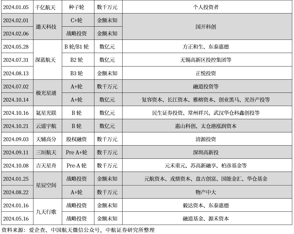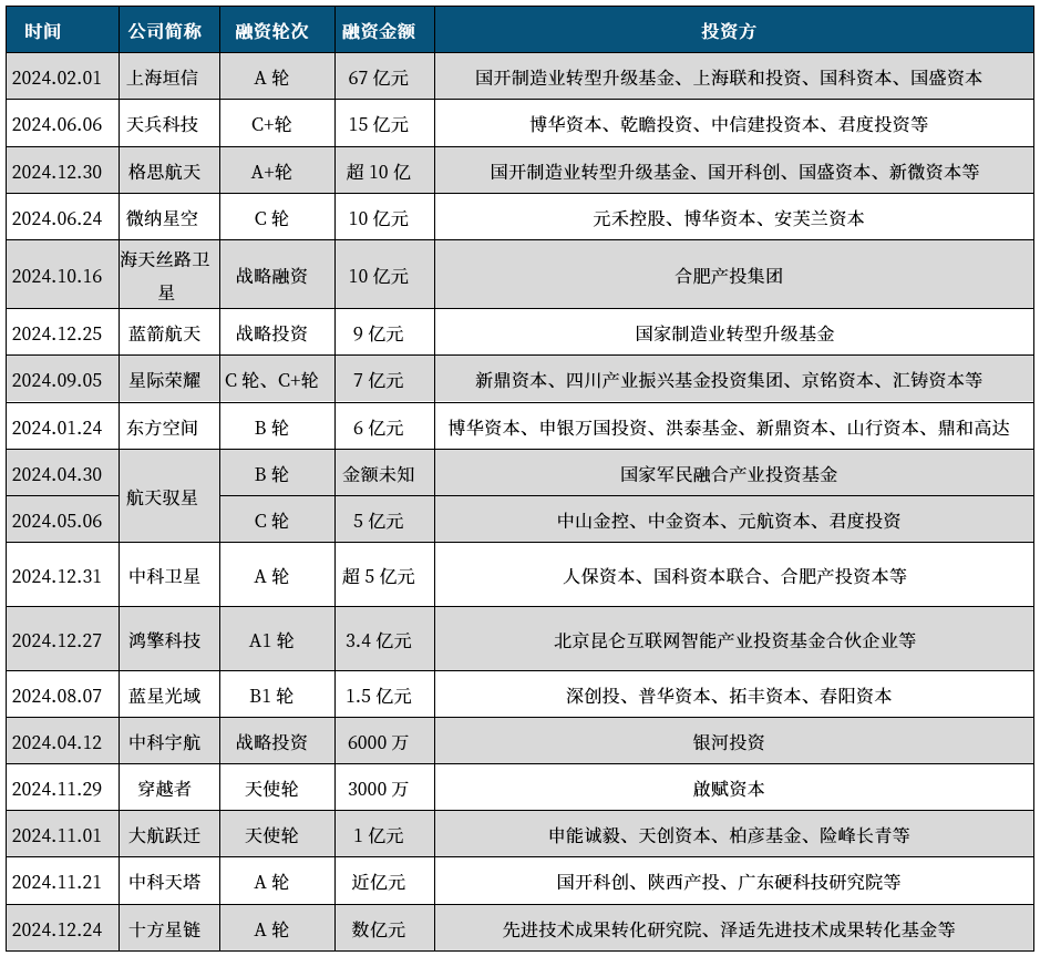 2024年“耐心资本”持续助力商业航天,一级市场完成多项过亿规模融资。2025年1月2日,中科星图子公司、专注于航天测运控领域的商业航天企业星图测控登陆北交所,募集资金总额1.9亿元。商业航天一级市场同样火热,根据我们统计,2024年我国商业航天一级市场发生35起融资事件,融资总额超过150亿元(仅统计披露具体数额的融资项目),涉及近30家企业。具体投融资信息详见下表。2025年1月初,国务院办公厅发布《关于促进政府投资基金高质量发展的指导意见》,明确“政府投资基金要聚焦重大战略、重点领域和市场不能充分发挥作用的薄弱环节,吸引带动更多社会资本……加快培育发展新质生产力”。我们认为,该意见有助于提振市场投资信心,催生更多的“耐心资本”进入商业航天产业,2025年商业航天产业投融资规模有望再提速。