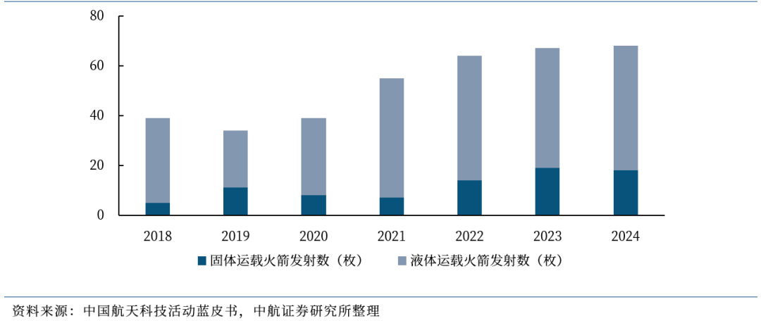 2024年,我国航天发射次数达到68次,发射次数再创新高。从火箭类型上看,我国航天发射所使用的运载火箭仍旧以液体运载火箭为主。