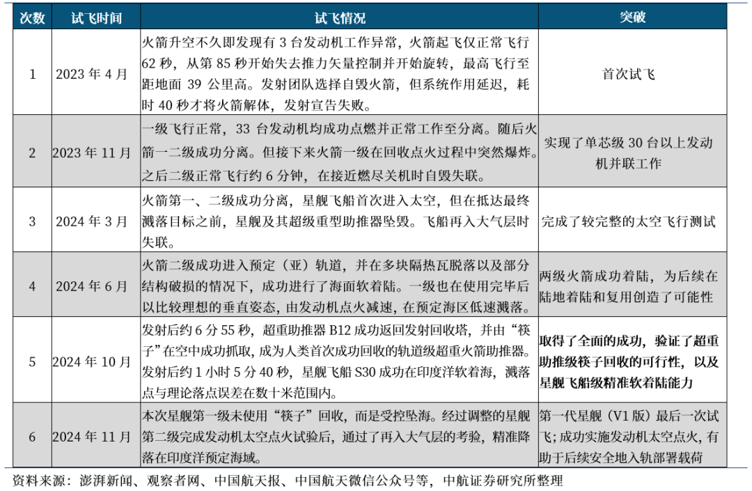2024年,美国太空探索技术公司(SpaceX)的星舰(Starship)成为全球航天发射关注的焦点。星舰在历经6次试验飞行后,已成功验证了一系列关键技术,实现了迭代进步。下表为星舰历次试飞的具体情况。