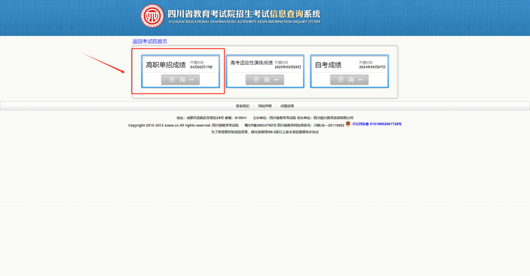 1、搜索四川省招生考试指导中心官方网站:https://www.sceeic.cn,进入主页面,点击进入“高职单招成绩查询”界面。