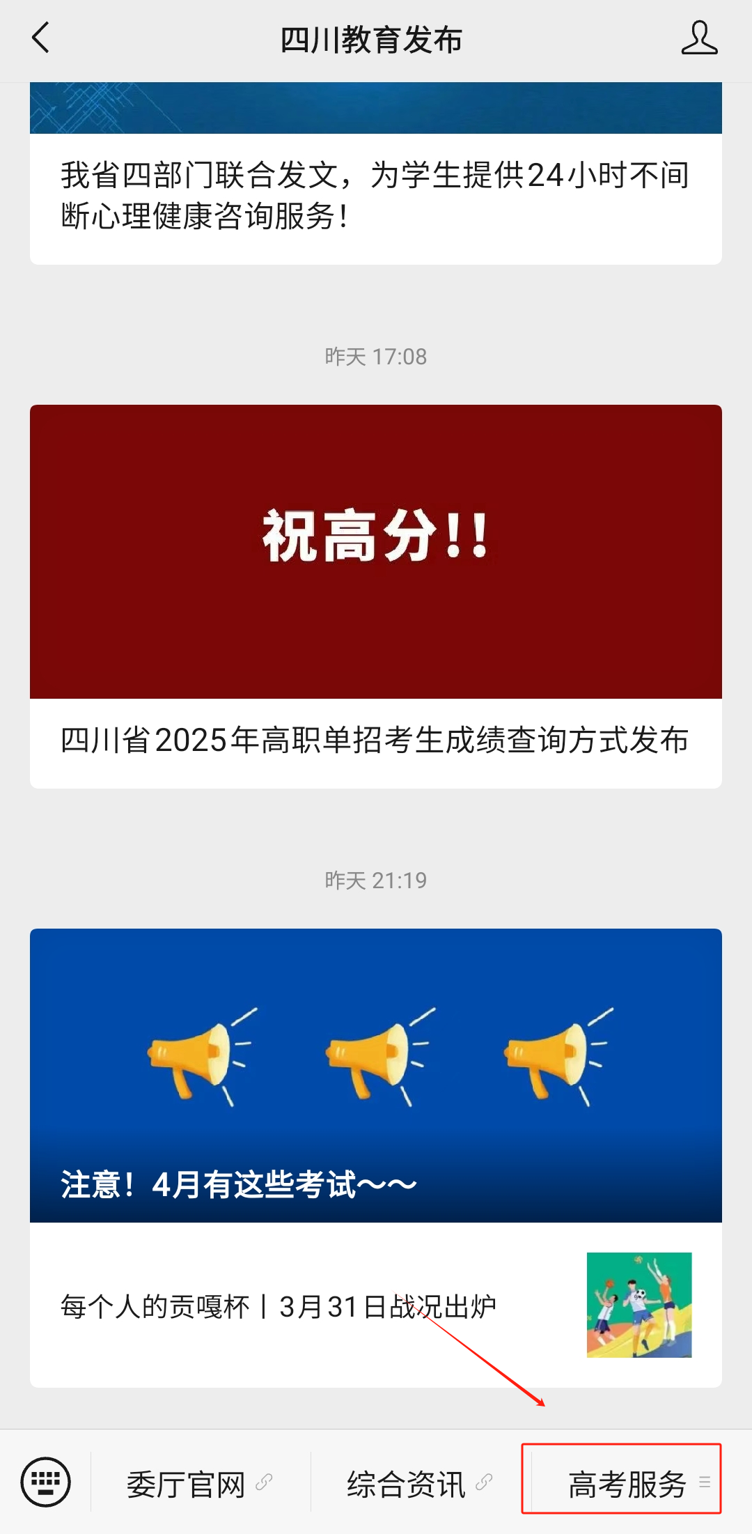 2、点击右下角“高考服务”-“高职单招成绩查询”。