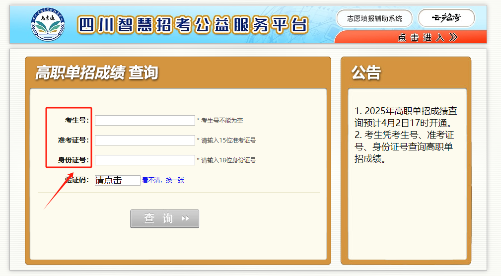 2、待查询开通时,考生凭考生号、准考证号、身份证号查询高职单招成绩。