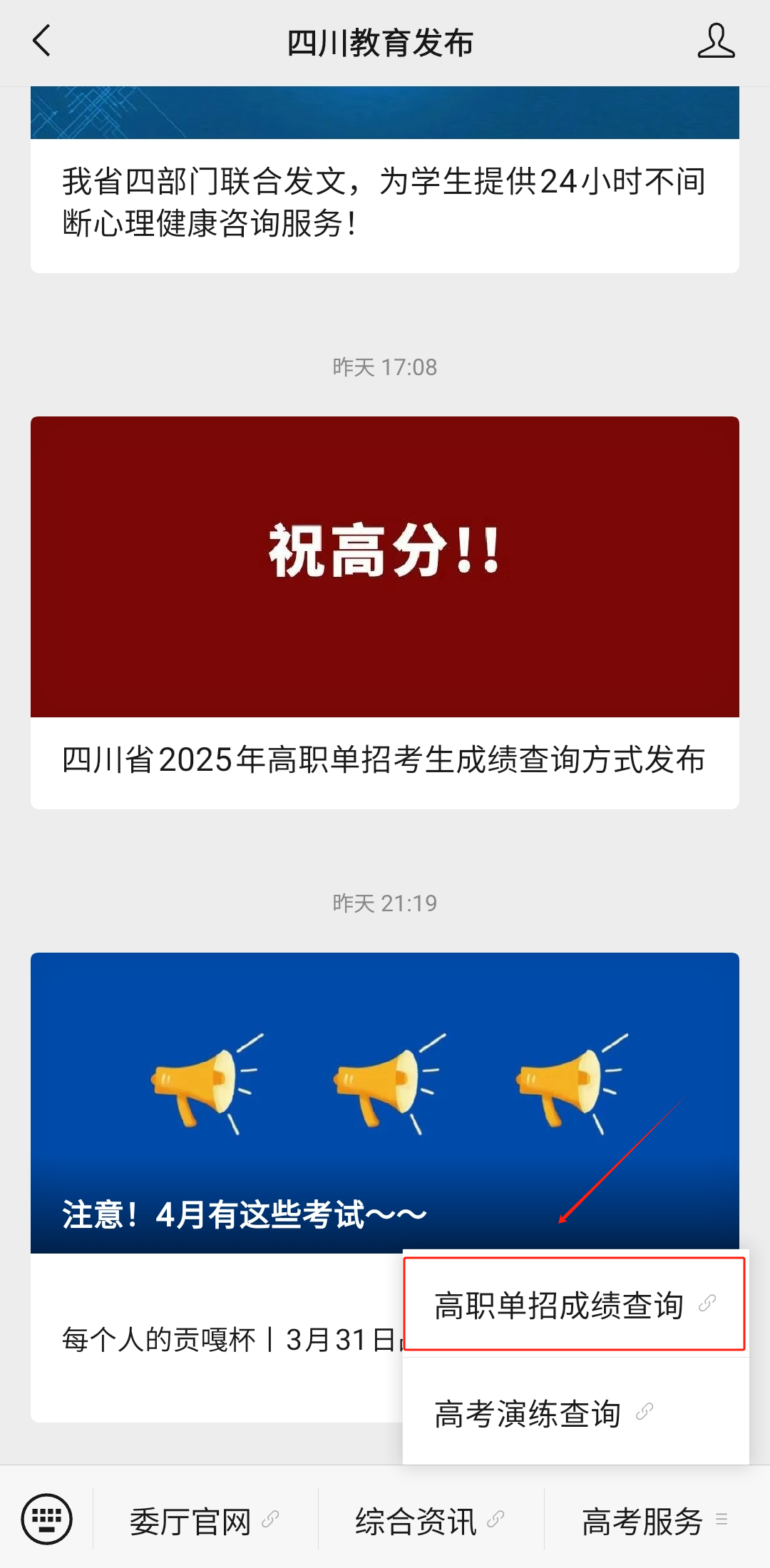 1、搜索四川省教育厅官方网站:http://edu.sc.gov.cn,进入主页面,点击进入“四川省2025年高职单招成绩查询”界面。
