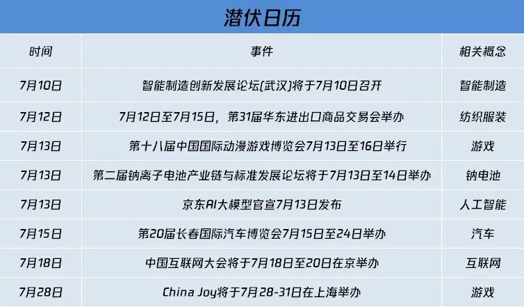 产业重要事件方面,智能制造创新发展论坛(武汉)将于7月10日在湖北省武汉市召开,本次论坛以“智造生态·筑网强基”为主题;第31届华东进出口商品交易会7月12日举办,华交会作为国内聚焦纺织服装和轻工产品行业最大的进出口贸易展会,已成长为仅次于广交会的具有重要国际影响力和吸引力的外贸盛会。2023京东全球科技探索者大会暨京东云峰会7月13日在北京举办,以“跨越·产业智能”为主题,聚焦大模型与产业深度融合,重磅发布京东大模型。