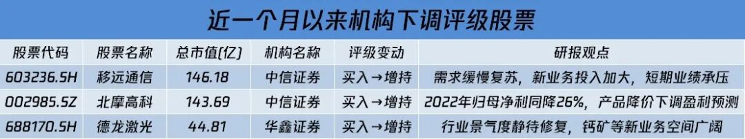 近一个月以来,移远通信、北摩高科等多只股评级遭下调。中信证券认为,移远通信去年下半年受困于疫情防控叠加海外需求疲软,公司收入增长放缓。进入2023 年,物联网下游需求缓慢复苏,同时公司加大对ODM、物联网天线、物联网平台、GNSS等新业务的投入,导致公司短期业绩承压。基于最新披露业绩以及下游需求复苏不及预期,以及公司对新业务加大投入,调整2023-2024年、新增2025 年归母净利润预测至7.12/8.78/11.38亿元,调整评级至“增持”。