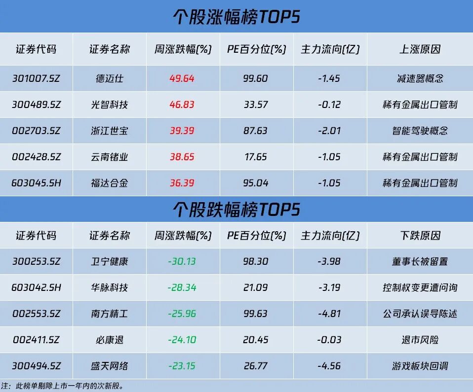 上周最牛股花落德迈仕,周涨幅接近50%,公司概念属于机器人板块中的减速器概念,近期有一些列的消息面刺激,除了一系列的地方政府的机器人支持计划之外,在WAIC大会上,马斯克继续大胆预计:机器人人数或超过人类数量。有色金属板块上周异军突起,跑出了光智科技、云南锗业、福达合金等多只牛股,消息面上,商务部、海关总署决定自8月1日起,对锗和镓两种关键金属实行出口管制。