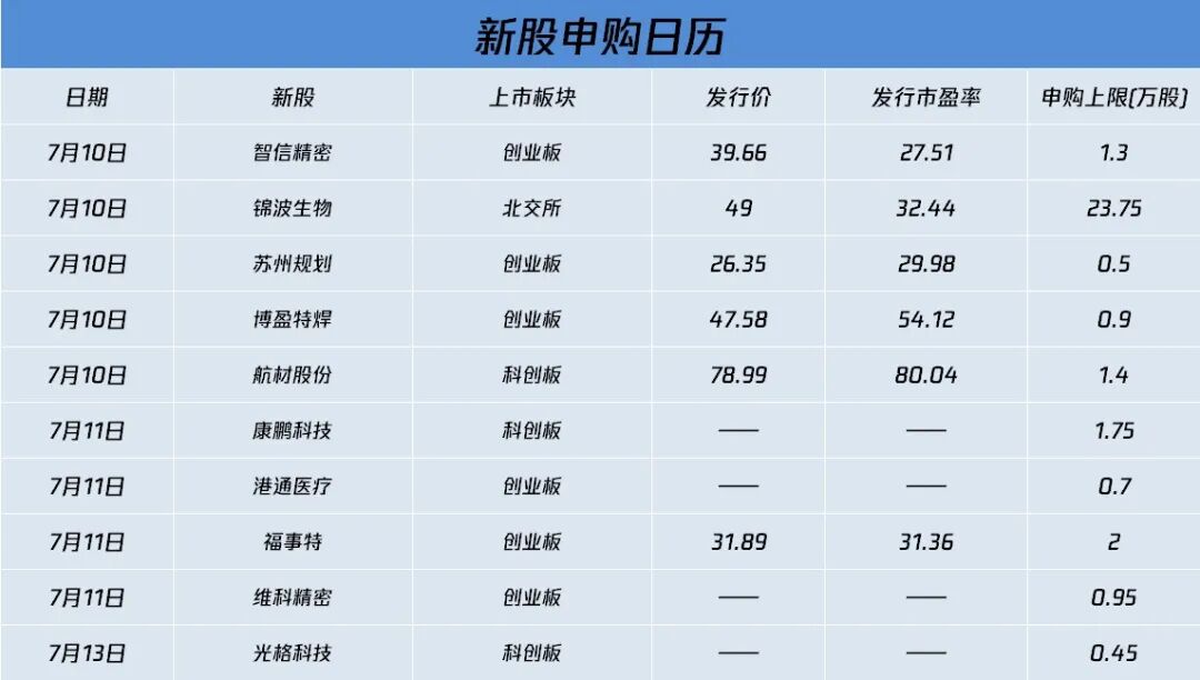1、投资日历:展望本周市场,国家统计局将公布6月CPI、PPI数据,中报季本周正式打响;外盘方面,美国6月CPI数据将公布,美股Q2财报拉开帷幕。产业重要事件方面,华交会等多个行业盛会召开。本周将有10只新股迎来申购。