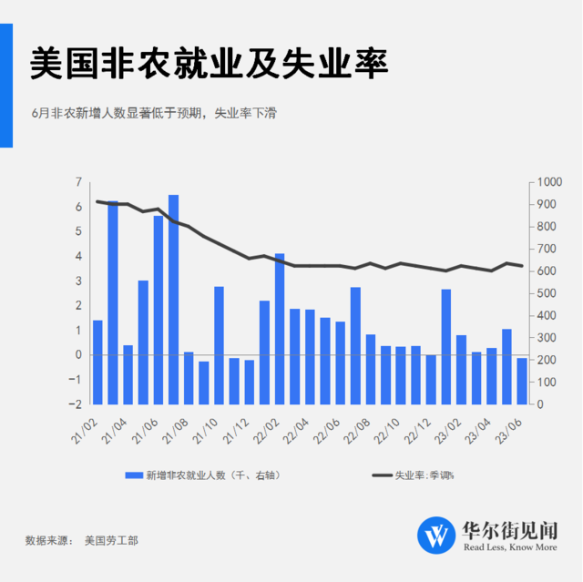 7月7日,美国劳工统计局公布数据显示,美国6月非农新增就业20.9万人,远低于预期的22.5万人,由于5月份数据从33.9万人下修至30.6万人,6月新增就业人数创下2020年12月以来最低纪录。此前,非农新增就业数据已连续14个月超过预期。6月失业率从5月下降0.1个百分点至3.6%,与预期持平。