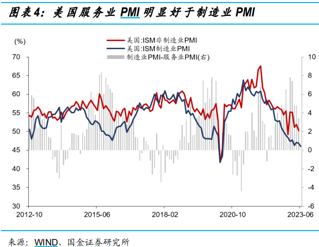 今年以来,美国ISM服务业PMI始终处于荣枯线以上,制造业则显著偏弱,二者分化,原因有几点:一是周期的错位,疫情后服务业的修复进度慢于制造业,美国服务业消费仍未弥补缺口,但商品消费已进入下行周期。二是服务业对加息的敏感性低于制造业,美国近两次加息周期里,服务消费的回落程度均低于制造业。三是服务业受劳动力供应节奏影响更大,服务业作为场景消费替代渠道更少,疫情后服务业职位空缺率较制造业扩大,使得服务业修复慢于制造业。