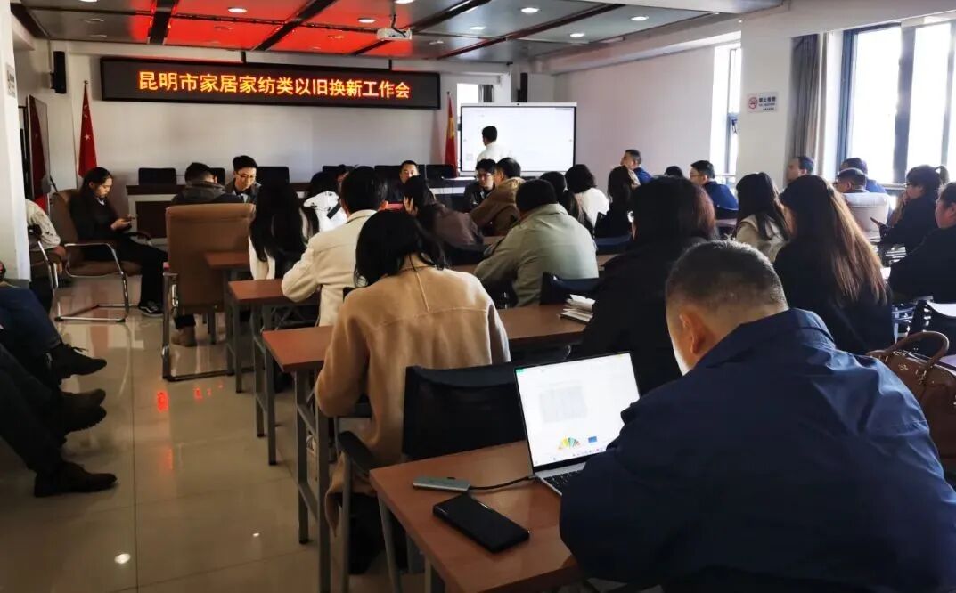 上午,市商务局副局长李永林在501会议室主持召开昆明市家居家纺类以旧换新工作会,会议邀请了7个县区商务部门、17个商城、银联现场参会,其他县区及企业通过腾讯会议线上参会。