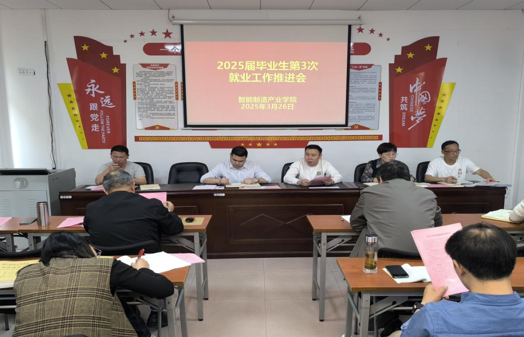 为深入贯彻落实党中央、国务院及全省关于高校毕业生就业工作的决策部署,促进2025届毕业生就业工作,提升就业服务质量。2025年3月26日,智能制造产业学院在仙女湖校区B栋104会议室召开2025届毕业生第3次就业工作推进会。本次会议由院长史洪松主持,党总支书记范向红、副院长彭秋梅以及全体教师参加。