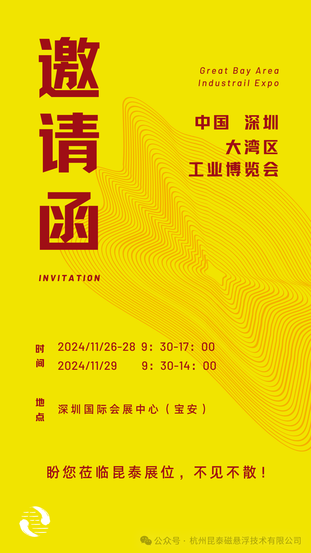 2024大湾区工业博览会将于11月26日-11月29日在深圳国际会展中心(宝安)举行。杭州昆泰磁悬浮技术有限公司诚邀您共享盛会。