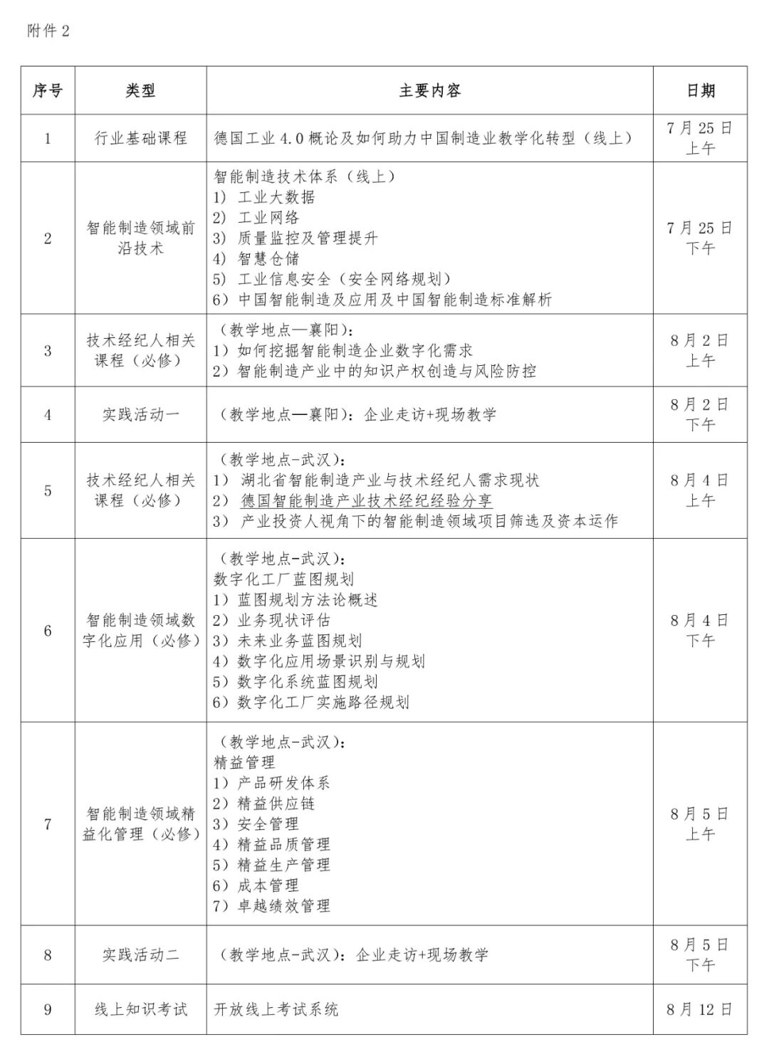 为贯彻落实《中国制造2025》、《建设高标准市场体系行动方案》等文件精神,发挥德国工业模式对于中国智能制造产业的借鉴作用及湖北技术经纪人在加速智能制造领域科技成果产业化、推动企业技术转型升级、创新观念升级的重要作用,培养一批既擅长制造管理又熟悉制造技术的复合型产业技术经纪人,特开展2022年湖北省德国工业4.0+中国智能制造深度研讨暨产业技术经纪人(智能制造方向)培训,具体安排如下: