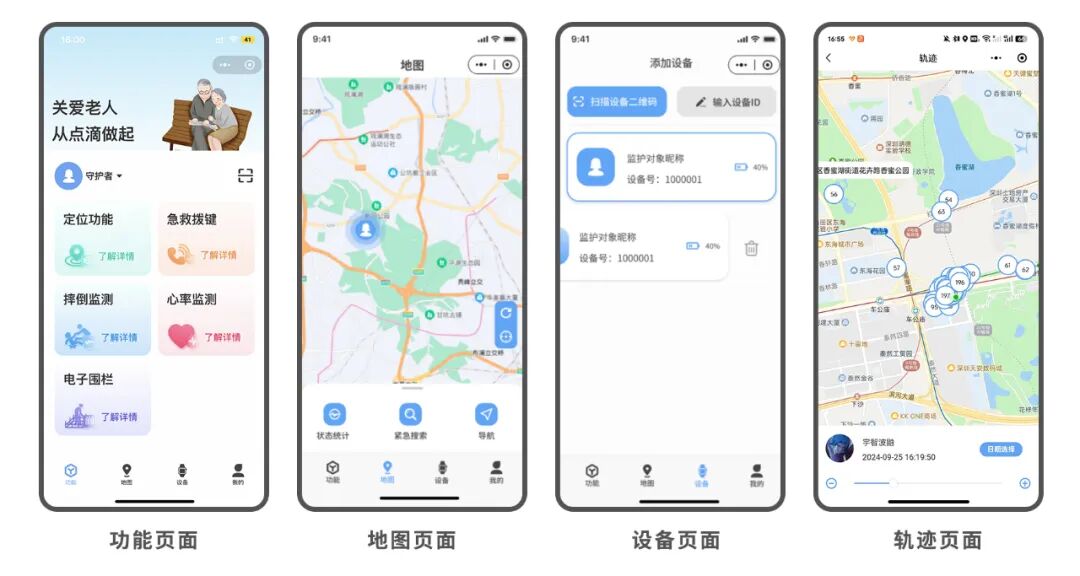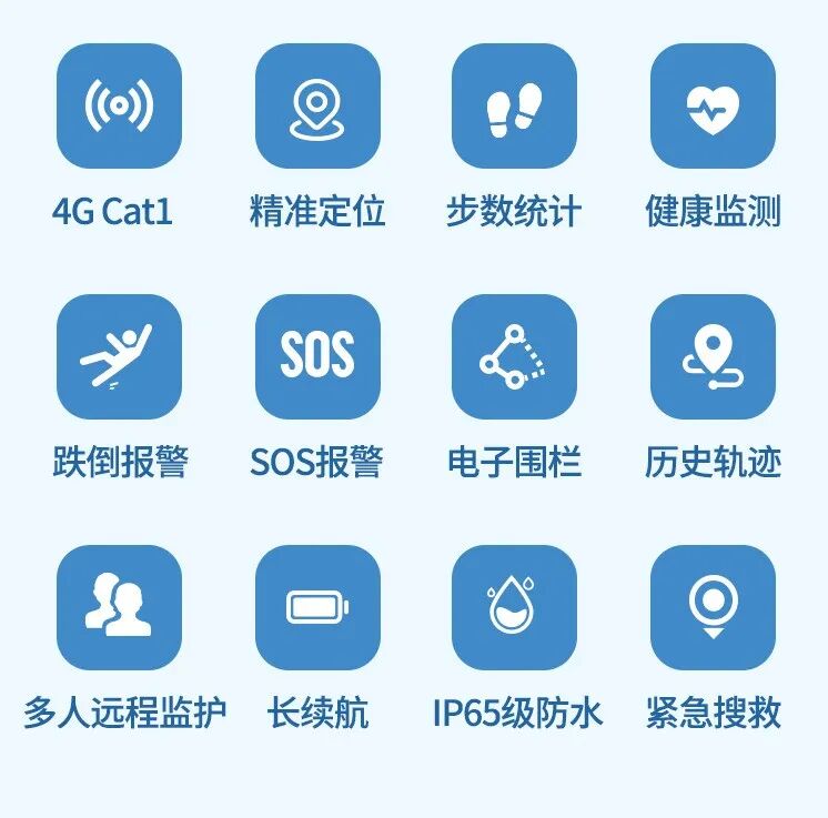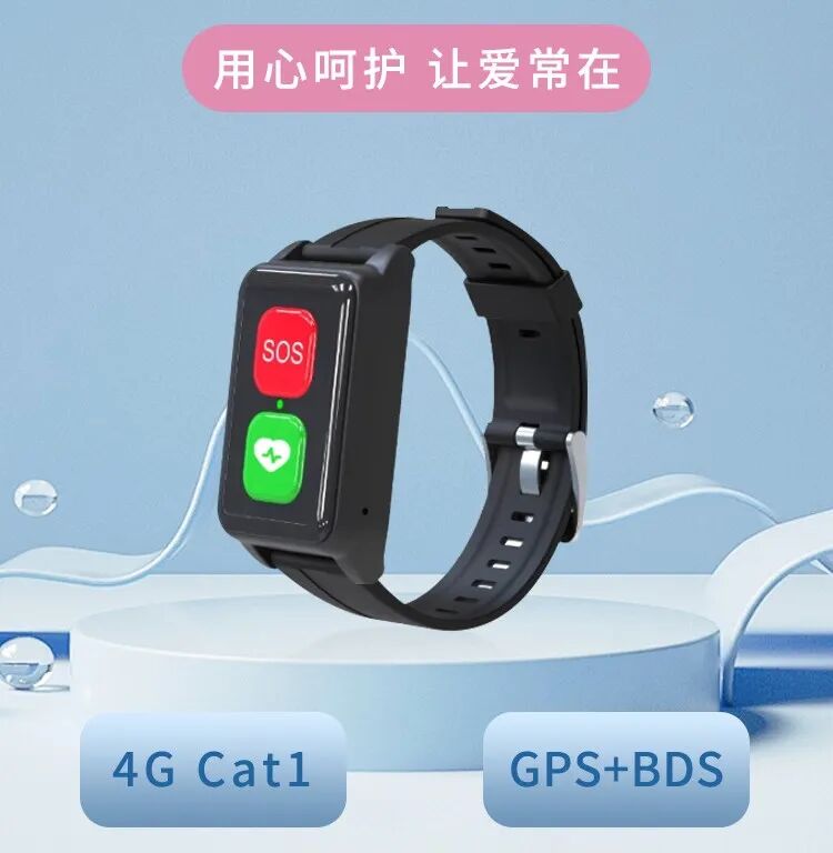 无线通信:采用4G Cat1标准,支持中国移动,中国电信,中国联通。 精准定位:采用卫星定位+WIFI定位技术。结合AI算法,可穿戴设备在复杂环境中提供更精准的定位服务。 步数统计:能够精准记录用户的步数,帮助了解该用户的运动情况。 心率监测:通过光学传感器实时监测用户的心率,提醒用户及时调整运动强度。 跌倒报警:通过传感器判断用户是否跌倒,方便监测该用户的身体状况。 SOS报警:当用户有意外,通过SOS按键即使联系到监护人。 电子围栏:设置围栏管理,用户进出围栏都有通知到监护人。 历史轨迹:支持30天用户活动轨迹及心率数据。 多人远程手机监护:添加监护人实现多人远程监护,确保突发异常第一时间监护人掌握。 长续航:内置高性能电池,续航时间长,不用频繁充电。