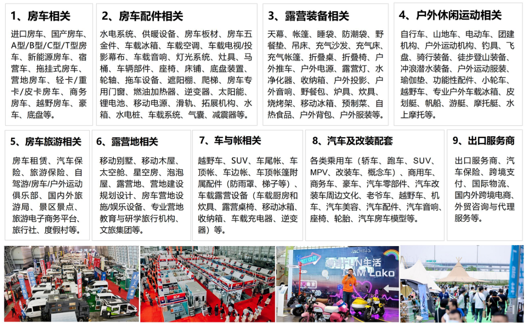 展品范围:涵盖进口及国产房车、房车配件、露营装备、露营地相关产品、房车旅游相关服务、户外休闲运动产品、车与帐相关产品、汽车及改装配套产品、出口服务商等。