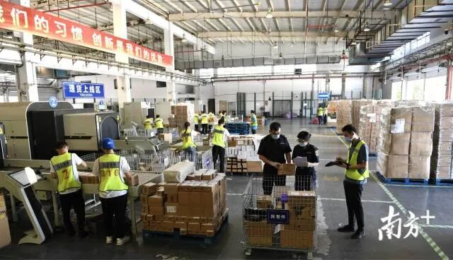 广州白云机场海关关员在跨境电商仓库巡仓监管。
