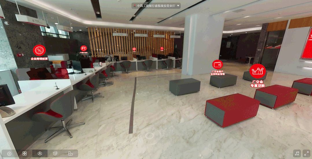 进入广交会官网的工商银行服务专区,可以看到最新上线的工行VR营业厅,如同置身实体营业厅内,通过指尖在电子屏幕上轻触滑动,便可畅游工行网点,了解广交会专属贷款、广交会客商信用卡等产品和服务。