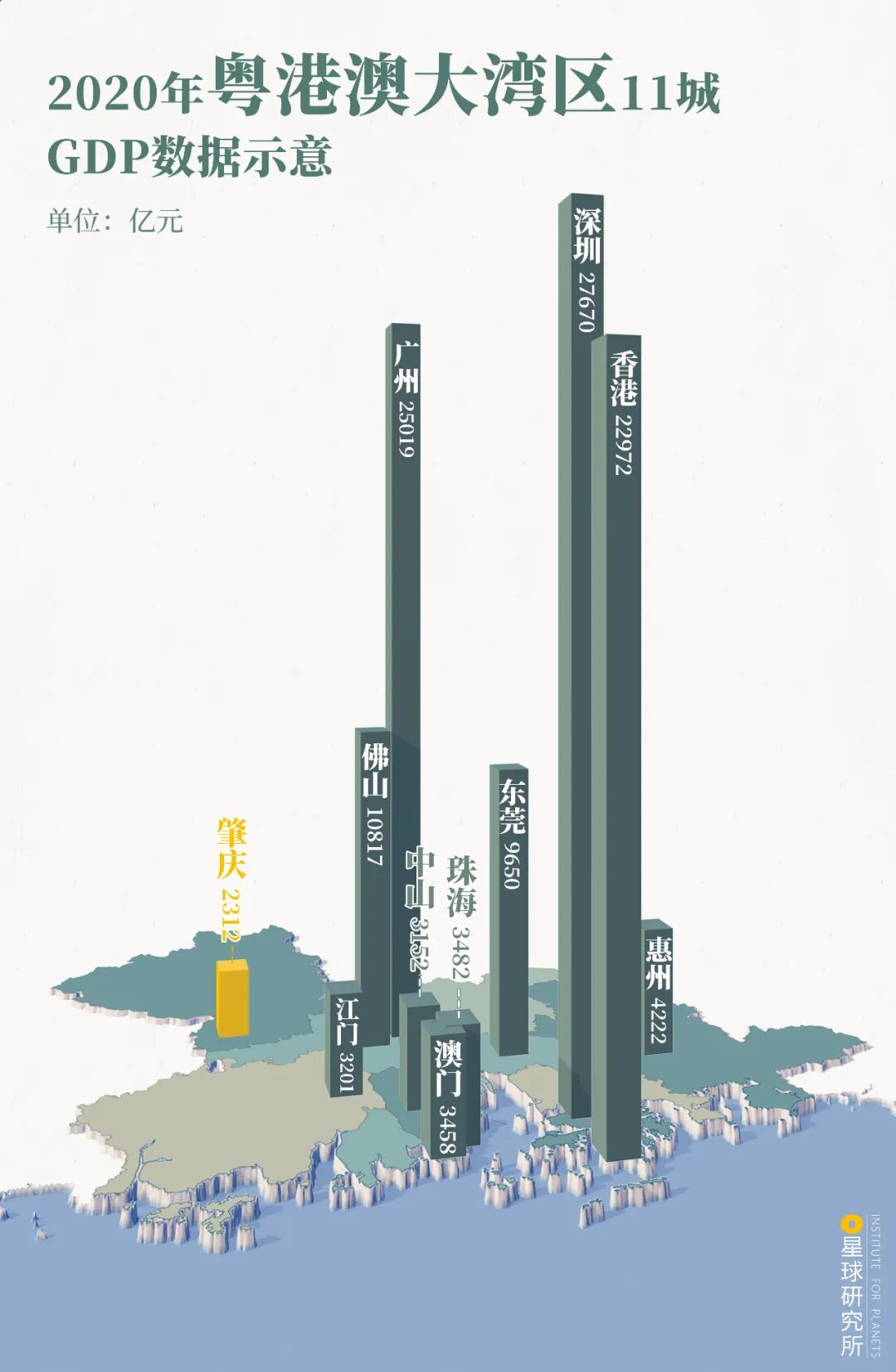 (2020年粤港澳大湾区11城GDP数据示意,制图@杨宁/星球研究所)