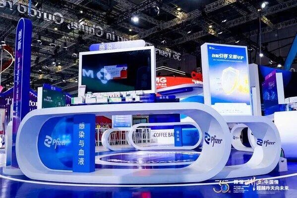 在医疗器械及医药保健馆,辉瑞制药展区是展馆中面积最大的展区之一,这也是辉瑞连续第六次亮相进博会的舞台。辉瑞以“辉瑞卅五中国情,超越昨天向未来”为参展主题,带来24款全球领先的创新产品及解决方案,其中4款为首发首秀。