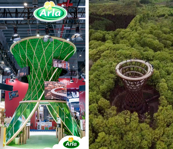 丹麦乳制品公司阿拉福兹(Arla Foods)连续第七年亮相进博会。展台设计以自然和有机为主题,融入丹麦简约风,提供舒适的参展体验。主塔中心结构受2019 年被评为世界最美场所之一的 The Forest Tower 启发,四周环绕 360°绿植,生动体现人与自然和谐共生的理念。特别的是,展台在搭建过程中使用环保材料、节能照明,并采用可拆卸再利用的模块化设计,强调其低碳环保的理念,让参观者感受到可持续发展的重要性。
