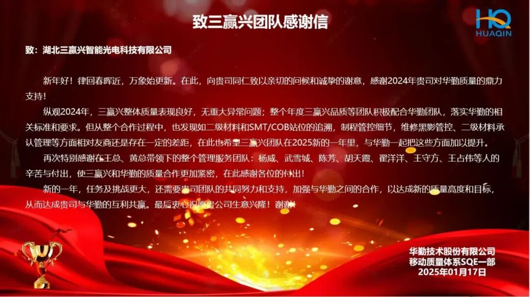 “客户是企业生存的土壤,客户的认可是企业发展的最好证明。”2024年,三赢兴科技凭借其在技术创新、产品质量控制、交货期保障等方面的出色表现,赢得了众多客户的高度认可,进一步拓展了市场,提升了品牌影响力。