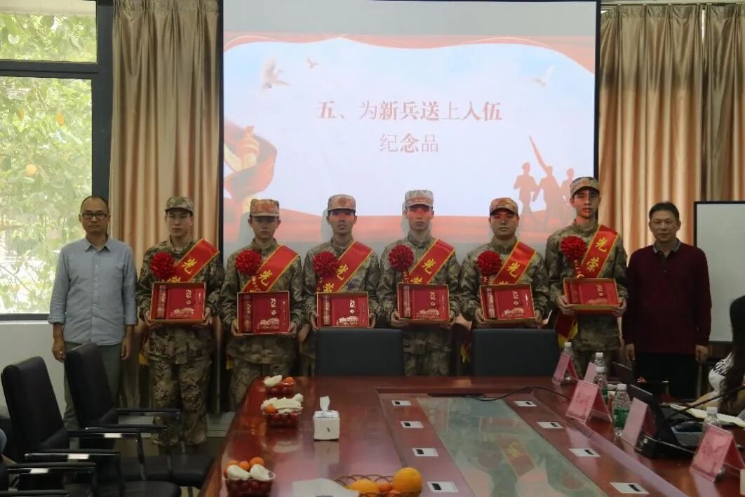 会上,学院党总支书记张小玉致辞,对光荣应征入伍的六名同学送上祝贺,并勉励他们一要坚定理想信念,将专业知识与国防现代化建设紧密结合,二要勇于在部队中“自找苦吃”、锤炼意志、增长才干,为强军事业贡献青春力量;对前来送兵的家属们表示欢迎并感谢他们在孩子成长的重要时刻支持孩子、陪伴孩子。接着,曾服役于武警部队江西总队某支队侦察中队的机器人232班叶林宏同学分享军旅经历,并鼓励新战友勇担使命,尽快完成从校园学子到合格军人的蜕变。随后,张小玉和吴新风代表学院向新兵赠送定制的从军纪念礼盒。