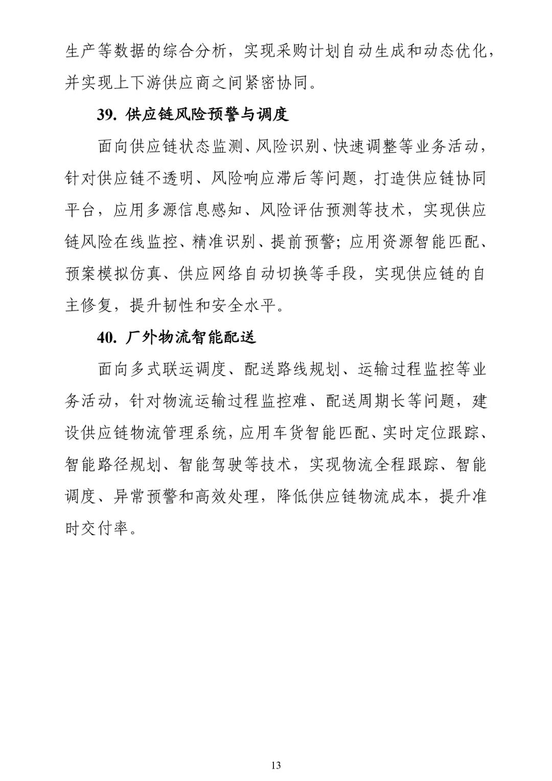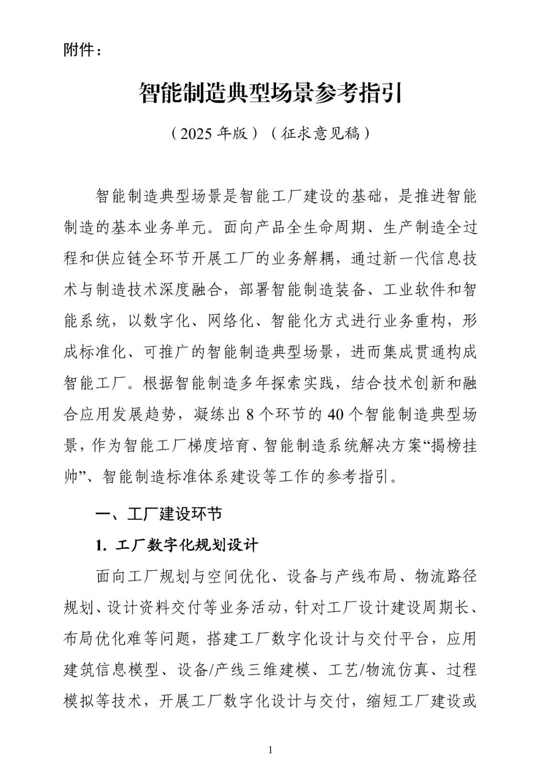 意见稿根据智能制造多年探索实践,结合技术创新和融合应用发展趋势,凝练出工厂建设、产品研发、工艺设计、生产管理、生产作业、运营管理、产品服务、供应链管理8个环节40个智能制造典型场景,作为智能工厂梯度培育、智能制造系统解决方案“揭榜挂帅”、智能制造标准体系建设等工作的参考指引。