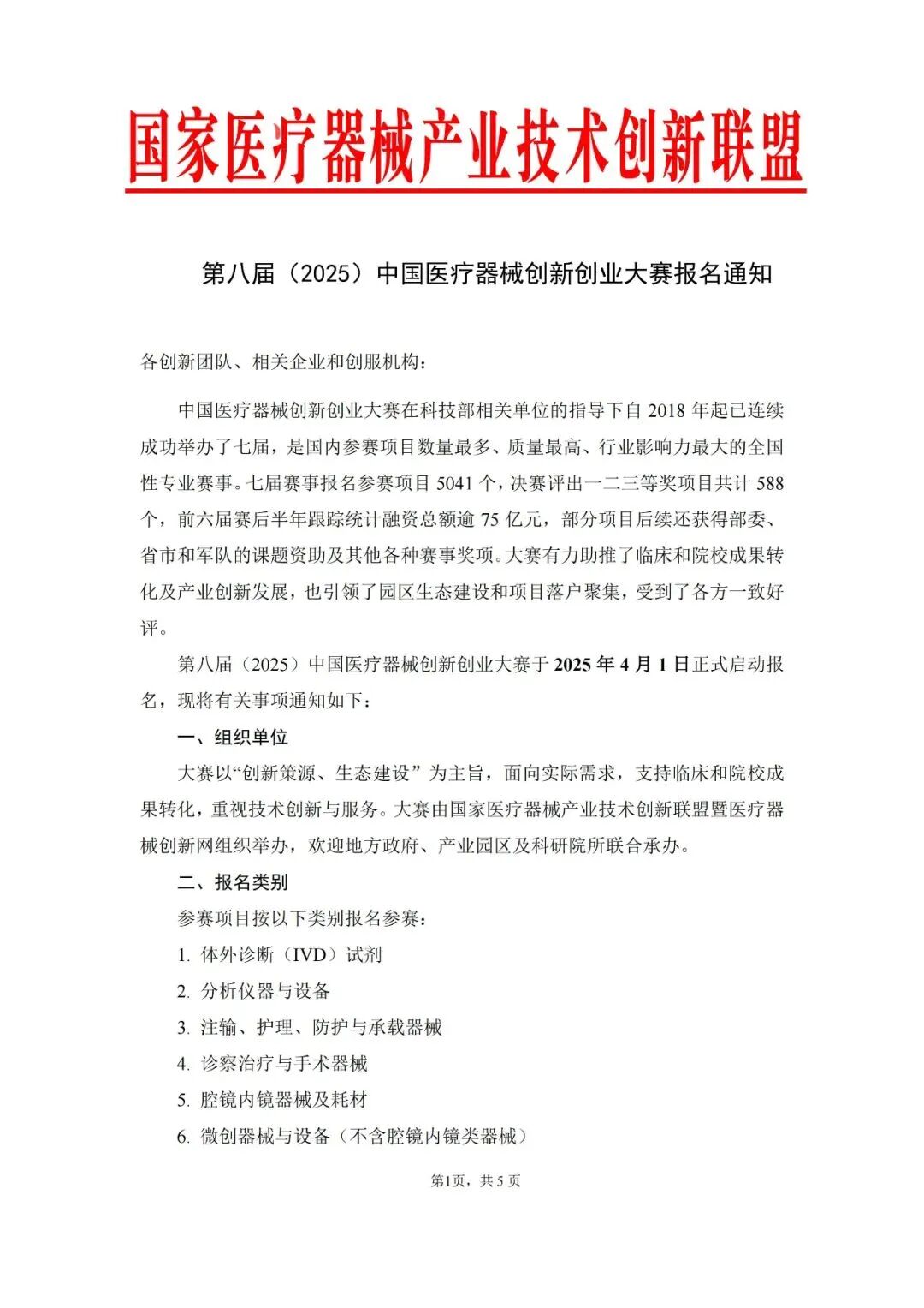 第八届(2025)中国医疗器械创新创业大赛于2025年4月1日正式启动报名,现将有关事项通知如下: