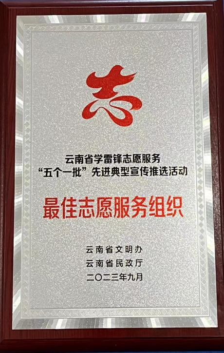 在学校的指导下,通过协会众多志愿者的不断努力,协会荣获云南省学雷锋志愿服务“五个一批”先进典型宣传推选活动中获得了“最佳志愿服务组织”的称号。
