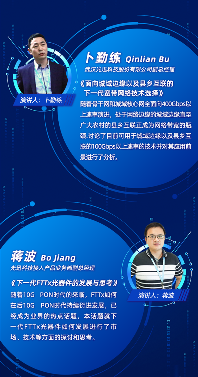 此外,光迅科技股份有限公司副总经理卜勤练、光迅科技接入产品业务部副总经理蒋波为大众带来了《面向城域边缘以及县乡互联的下一代宽带网络技术选择》和《下一代FTTx光器件的发展与思考》的主题演讲。