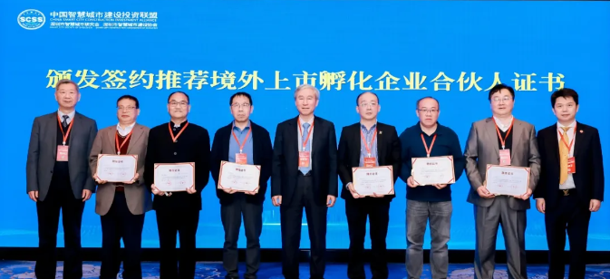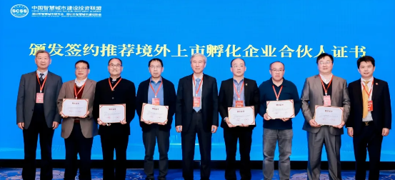 主题分享之后,全国工程勘察设计大师\中国智慧城市建设投资联盟主席\深圳市智慧城市研究会会长\首席科学家陈宜言教授、中智联执行主席张晓新教授和中智联总秘书长\执行会长\傲盛(深圳)企业孵化有限公司孙志光董事长,共同为32位已签约的推荐境外上市孵化企业合伙人颁发证书。
