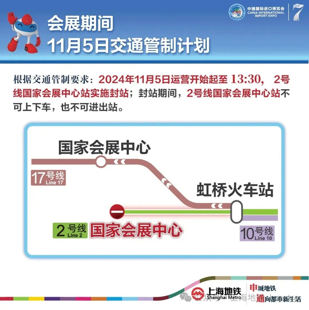根据交通管制要求:2024年11月5日运营开始起至13:30,2号线国家会展中心站实施封站。封站期间,2号线国家会展中心站所有出入口关闭,乘客不可上下车,也不可进出站,需要前往国家会展中心站的乘客,可在虹桥火车站下车换乘17号线。