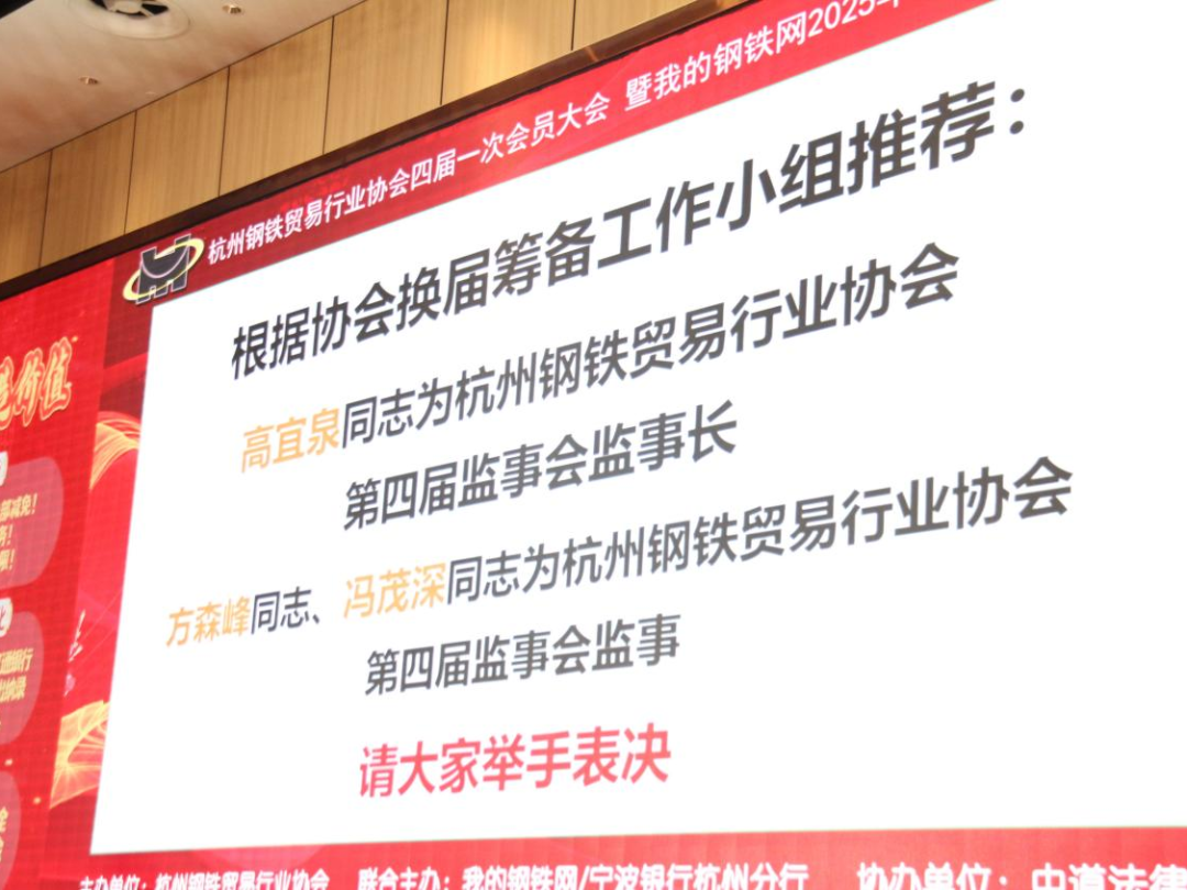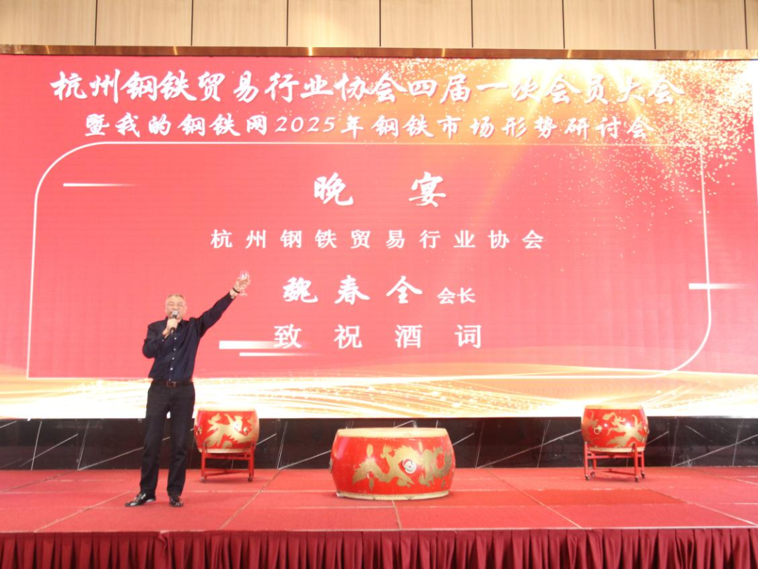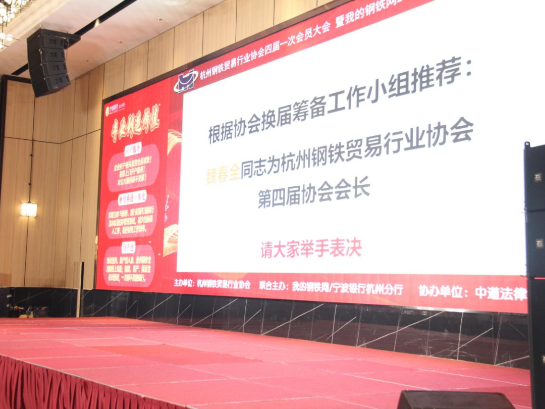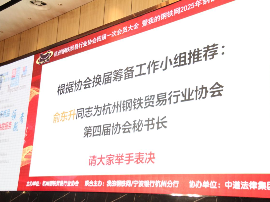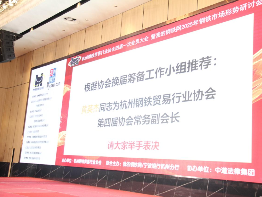 3月22日下午,杭州钢铁贸易行业协会在杭州绍兴路538号浙江三立开元名都大酒店二楼三立厅隆重召开四届一次会员大会暨我的钢铁网2025年钢铁市场形势研讨会。此次大会由上海钢联电子商务股份有限公司、宁波银行杭州分行联合主办,中道法律集团协办,协会近300家会员和金华、丽水、宁波、温州、台州等兄弟城市钢铁商协会领导应邀参加了此次大会。
